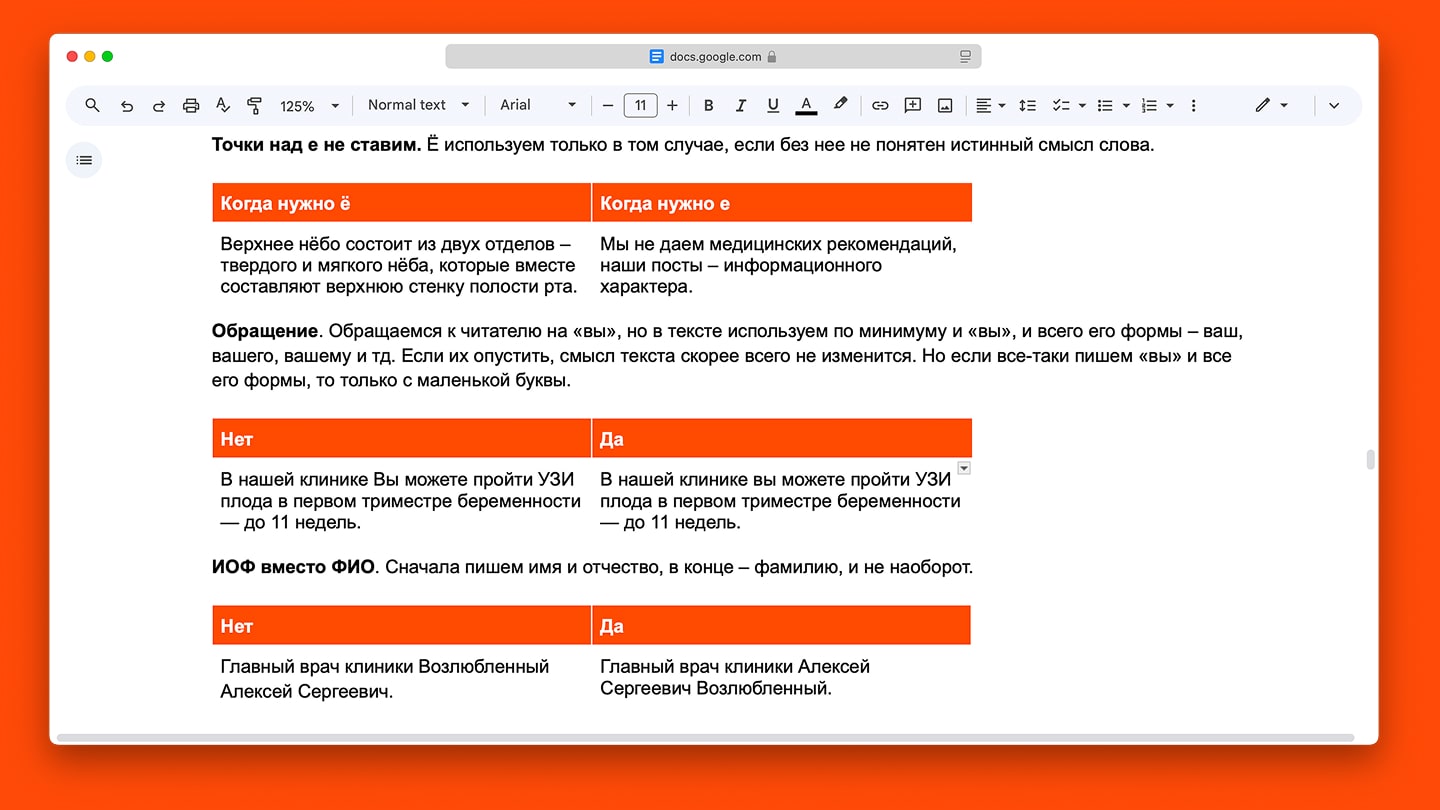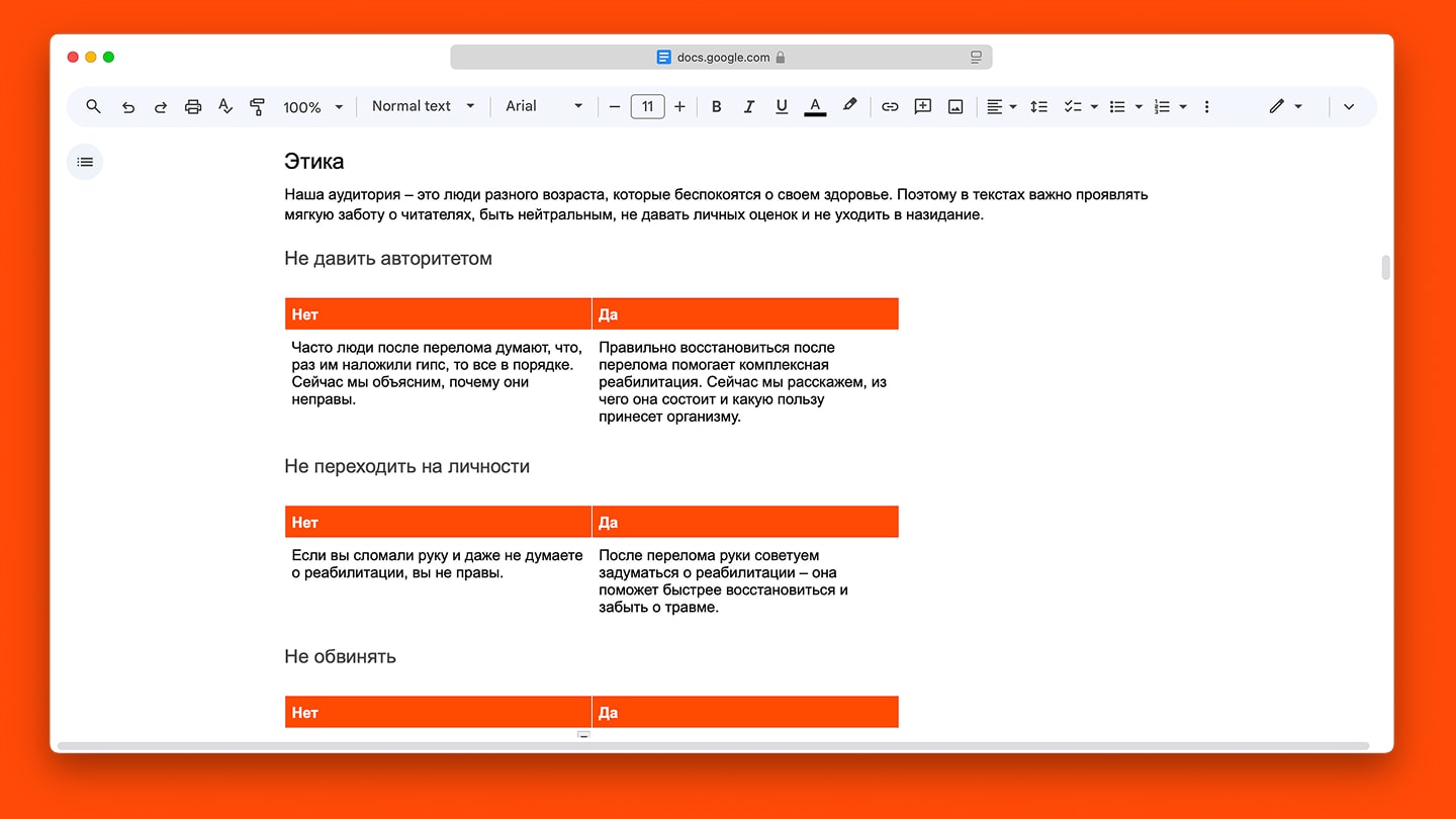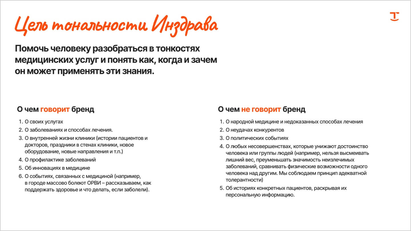 Зафиксировали подход в двух документах — Tone of Voice и редполитике. В первом прописали, на какие темы и в какой тональности Инздрав общается с аудиторией. А во втором — дали подробную инструкцию с примерами: прописали, какие слова используем, а какие нет, пишем «е» или «ё» и так далее.