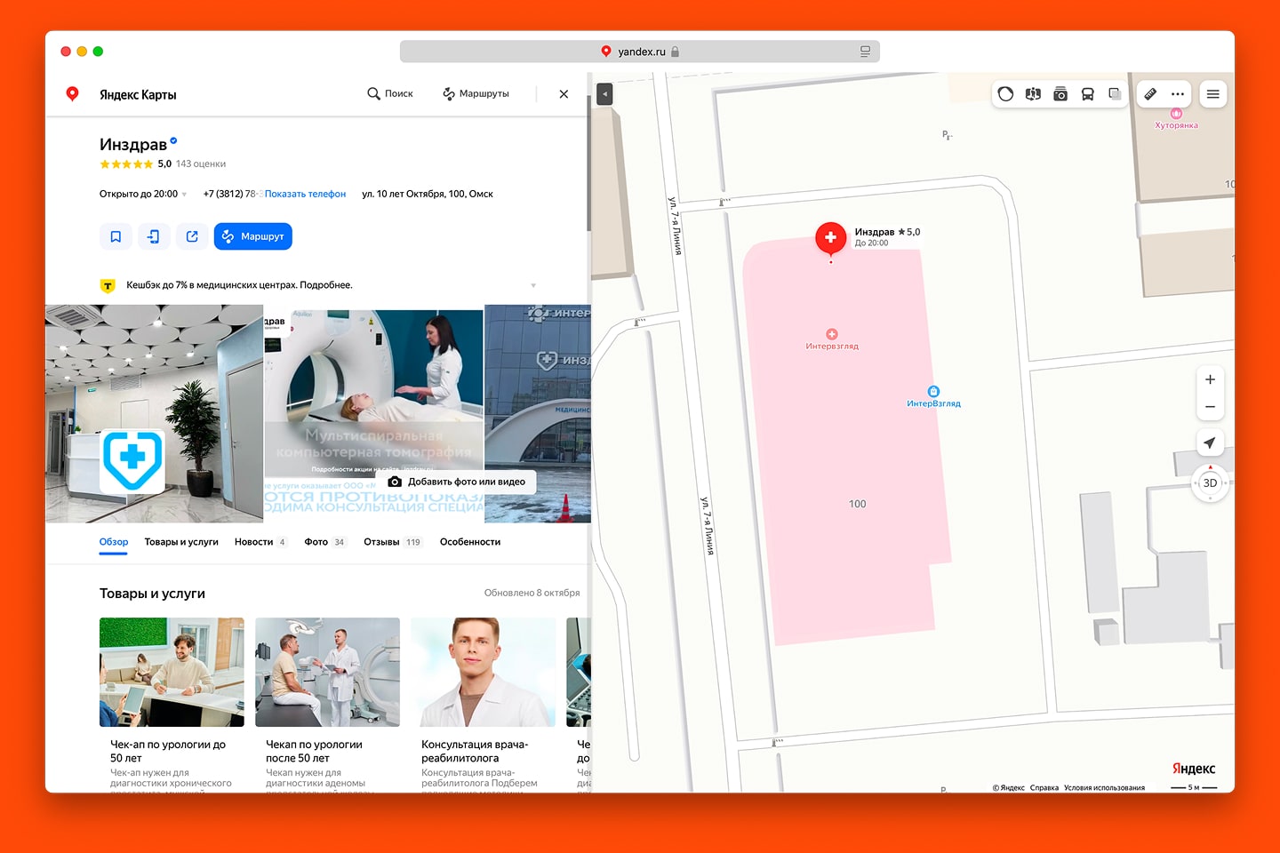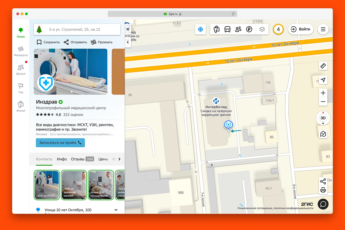 Работает так: мы оформили профили на популярных онлайн-картах и подключили внутреннюю платную рекламу и геомаркетинг: когда пользователь ищет медицинские услуги на карте, ему подсвечивается клиника. Например, пациент ищет лор-врача в 2GIS и видит Инздрав первым в списке.