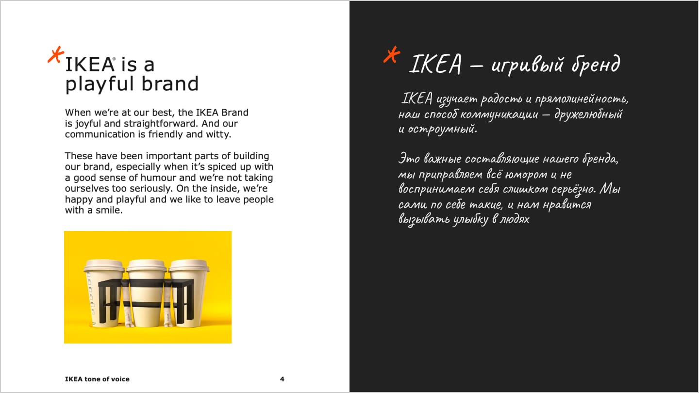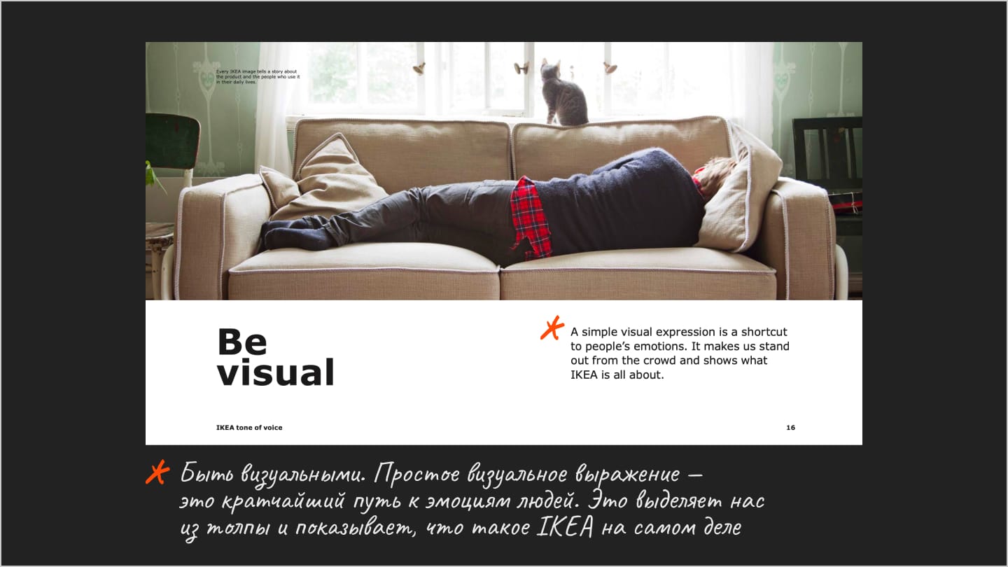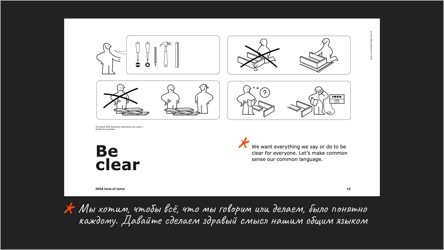 ToV — это часть брендинга. У любого бренда с лояльной аудиторией есть свой, устоявшийся способ коммуникации, достаточно вспомнить IKEA, McDonalds, Coca Cola или наших ВкусВилл, Т-Ж, Aviasales, Красное и Белое. К примеру, вот несколько слайдов из ToV IKEA: