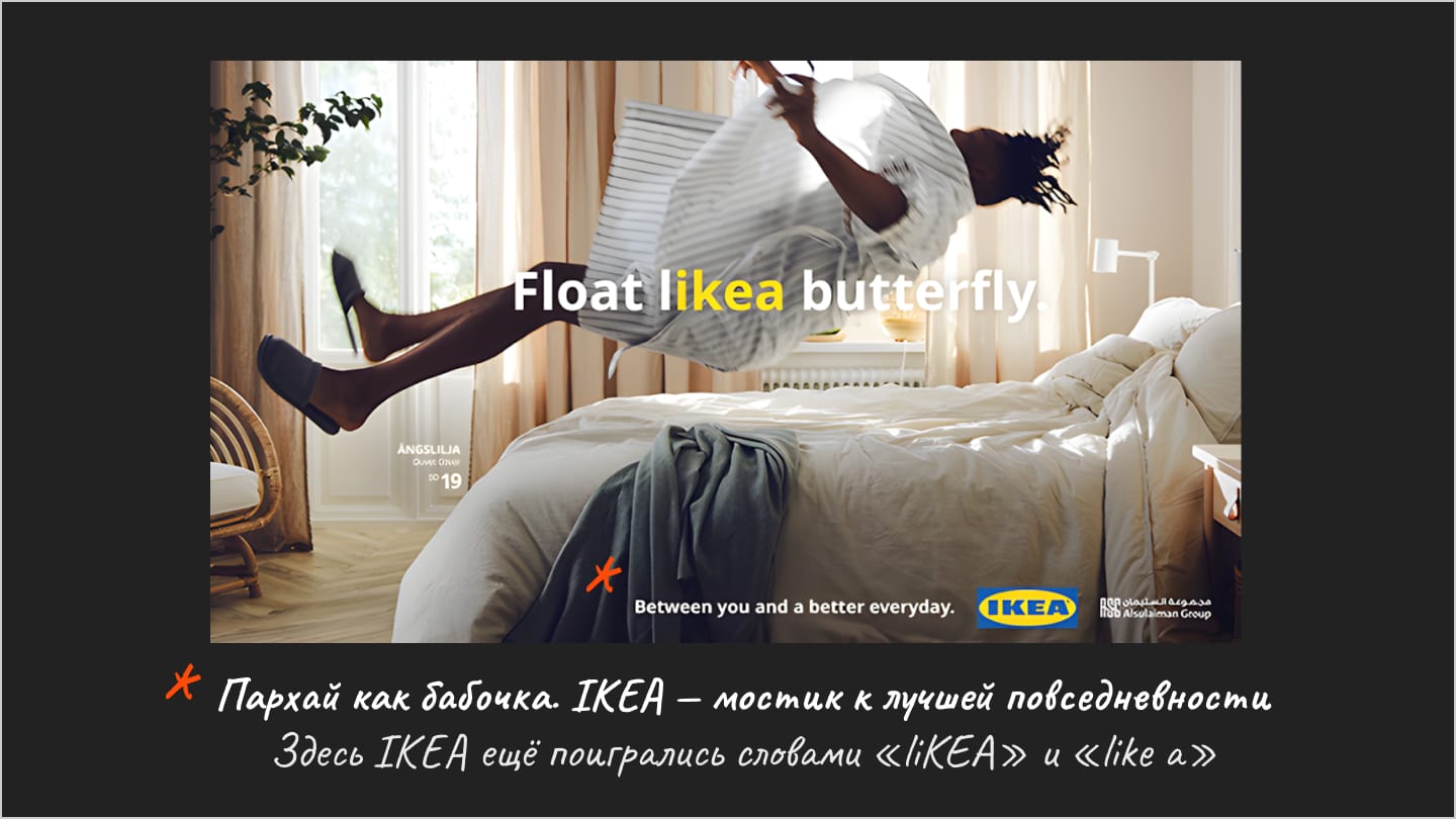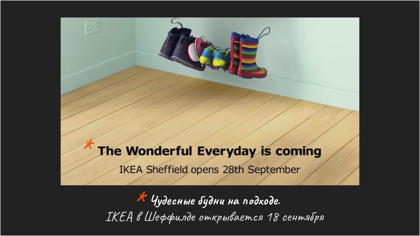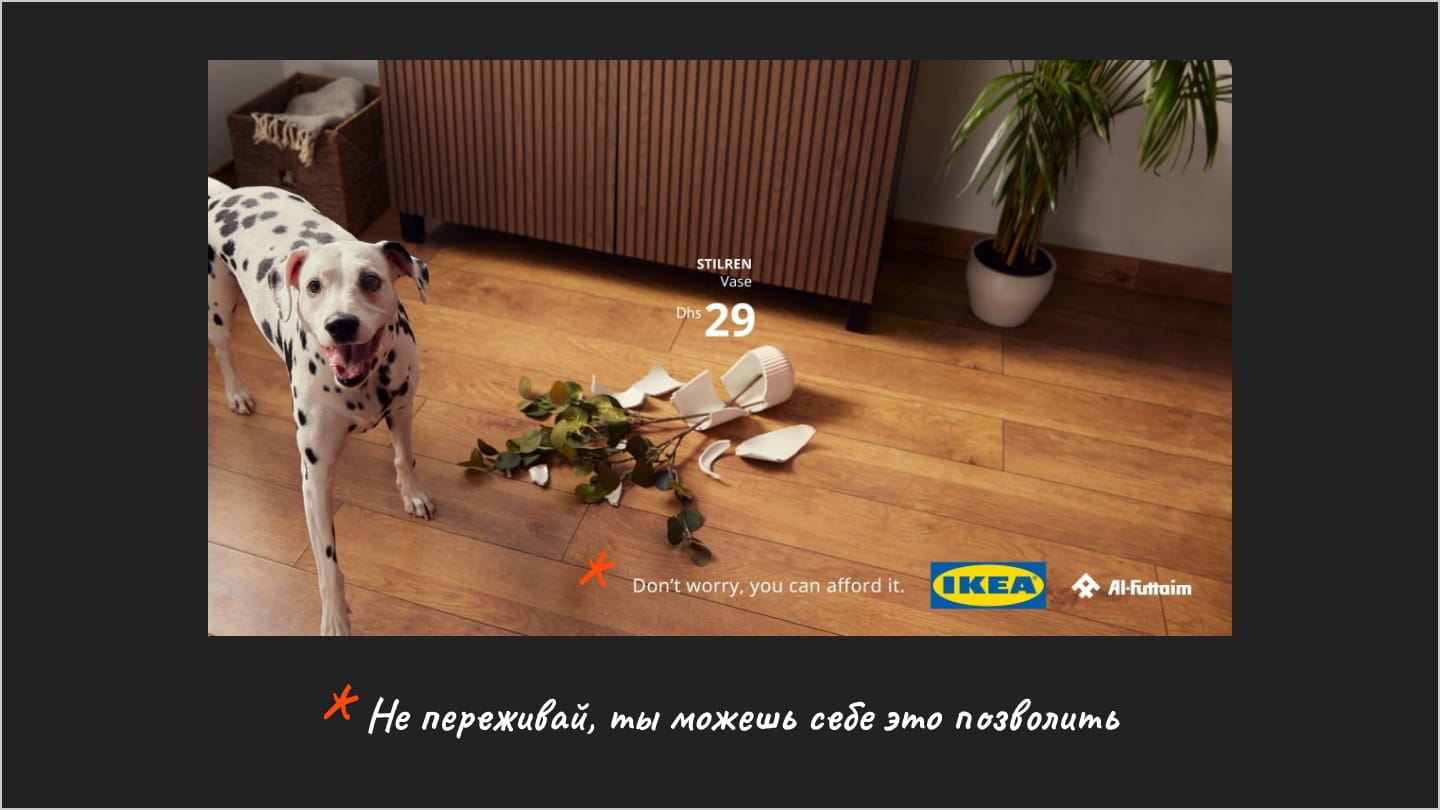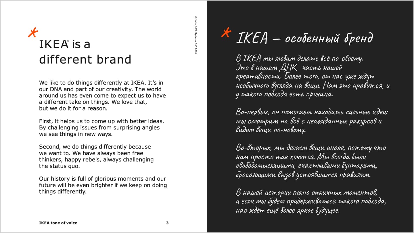 ToV — это часть брендинга. У любого бренда с лояльной аудиторией есть свой, устоявшийся способ коммуникации, достаточно вспомнить IKEA, McDonalds, Coca Cola или наших ВкусВилл, Т-Ж, Aviasales, Красное и Белое. К примеру, вот несколько слайдов из ToV IKEA: