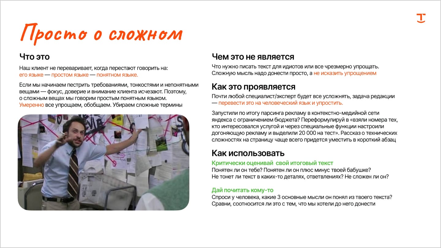 - Ситуация 3. ToV есть и все каналы коммуникации звучат едино. Возьмём для примера Т-Банк: у них весь контент — сайт, сторисы, статьи, PUSH-уведомления, чат поддержки — звучит в одной тональности. Ты уже плюс-минус знаешь, чего ждать от компании, про что она и для кого, какие ценности транслирует. А главное — уверен, что в случае чего тебе постараются помочь. Это и есть пример выстроенных отношений с клиентом, которые, в свою очередь, ведут к увеличению продаж и повышению лояльности аудитории.