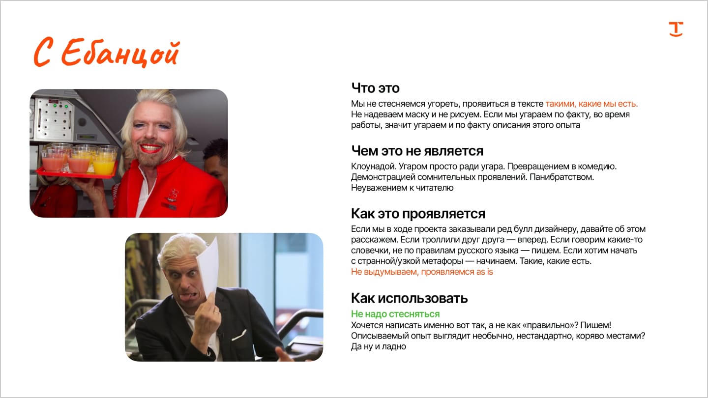 - Одного ToV недостаточно — с ним в купе разрабатывают и редполитику. Это уже больше прикладная инструкция преимущественно для копирайтеров, в которой подробно расписывают, о чём и как пишет бренд: какие слова использует, какие нет, пишет рубль словом или ставит знак ₽, и так далее.